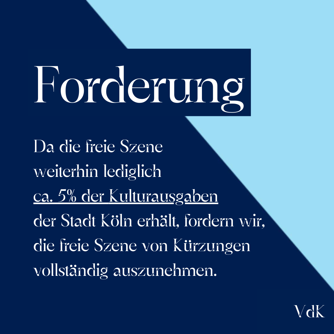 Da die freie Szene weiterhin lediglich ca. 5% der Kulturausgaben der Stadt Köln erhält, fordern wir, die freie Szene von Kürzungen vollständig auszunehmen.